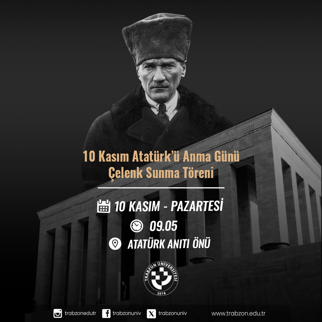 10 Kasım Atatürk'ü Anma Günü münasebetiyle 10 Kasım 2025 Pazartesi günü saat 09.05'te Atatürk Anıtı önünde (Rektörlük Önü) Çelenk Sunma Töreni gerçekleştirilecektir.